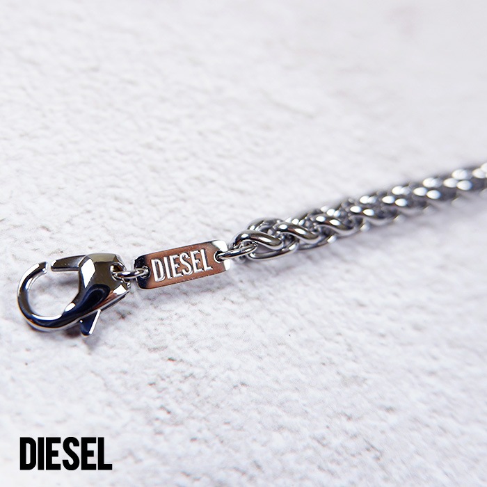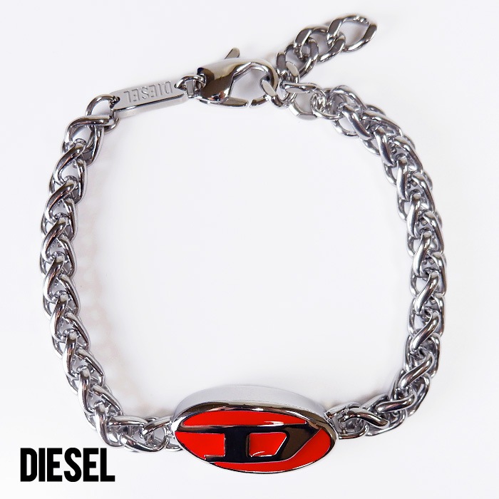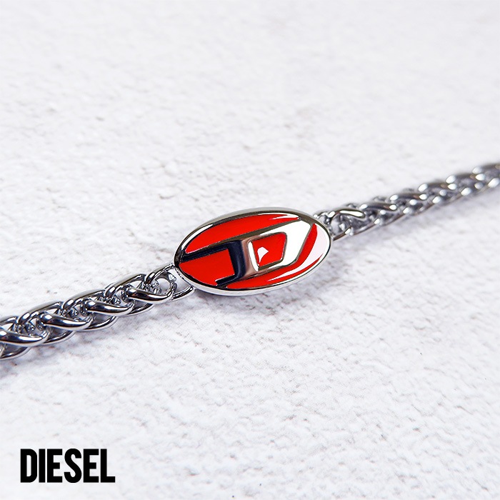 Dieselのステンレススチール製チェーンブレスレット。エナメル調のレッドロゴが長袖・半袖問わずお手元をおしゃれに着飾ります