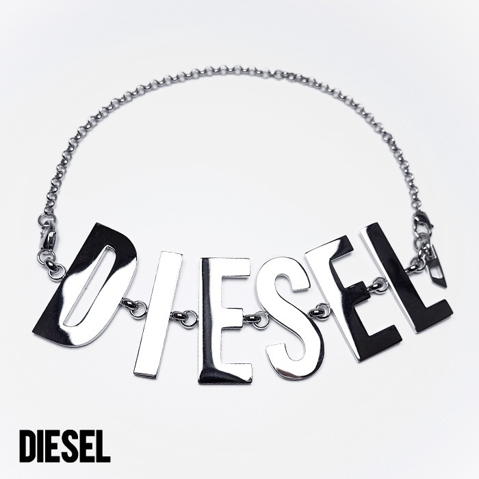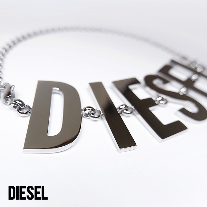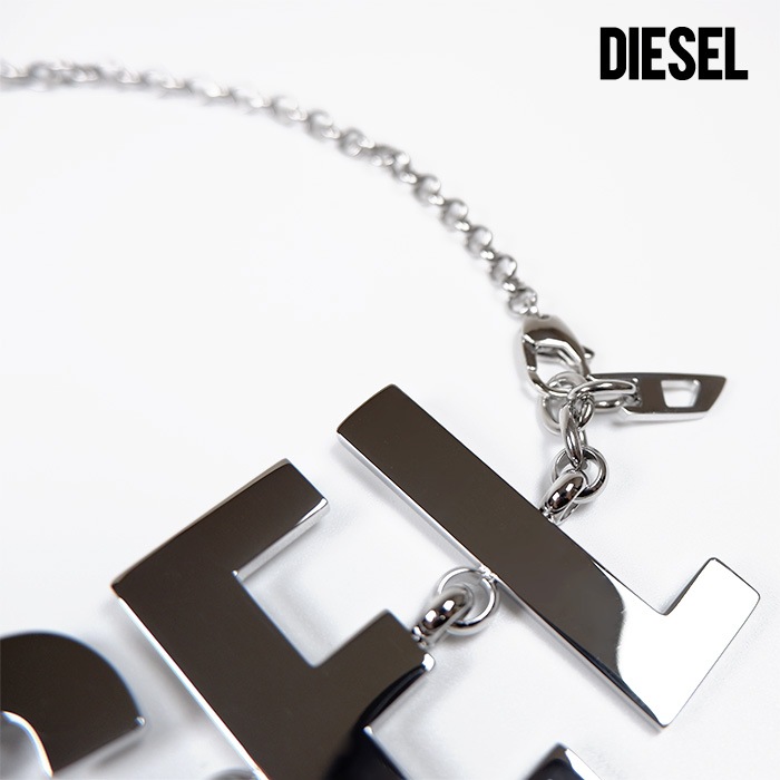 シルバーのDIESELロゴが際立つステンレススティール製ネックレス。