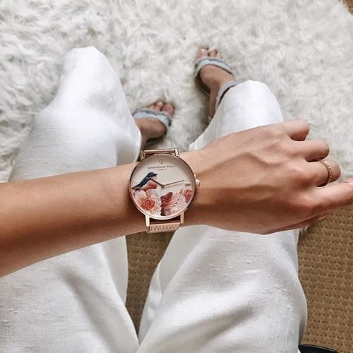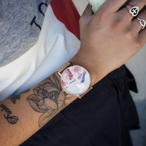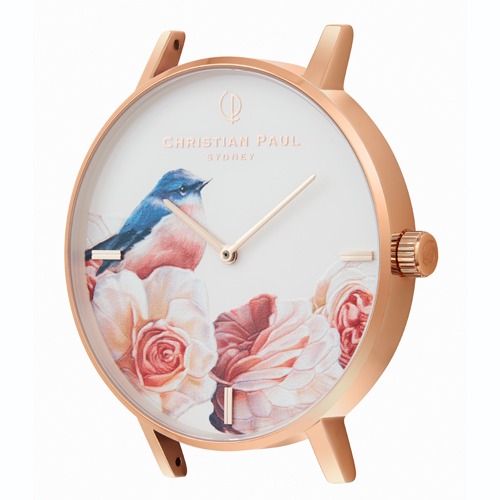 花柄に小鳥という可愛らしい、パッと目につく大胆で個性的なデザインの腕時計です。